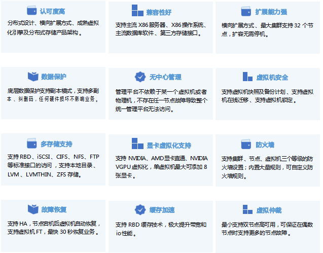 虛擬化場景融合計算和存儲資源,提供具有極簡 、高效 、可靠的虛擬化環(huán)境 。提供 OS 一鍵式交互安裝,支持業(yè)務的快速上線,靈活擴展 。對各類資源統(tǒng)一管理,按需分配,支持一鍵巡檢 、歷史性能數(shù)據(jù)統(tǒng)一監(jiān)控 。支持第三方虛擬化管理平臺 、CDP 保護平臺 。支持數(shù)據(jù)多副本及 EC 技術 ,大幅提升用戶可得容量 。提供多種安全可靠策略 ,HA 高可用 、備份計劃,虛擬機保護,保障業(yè)務連續(xù) 。